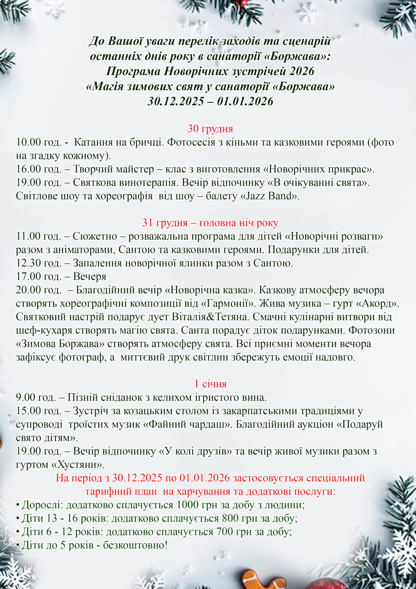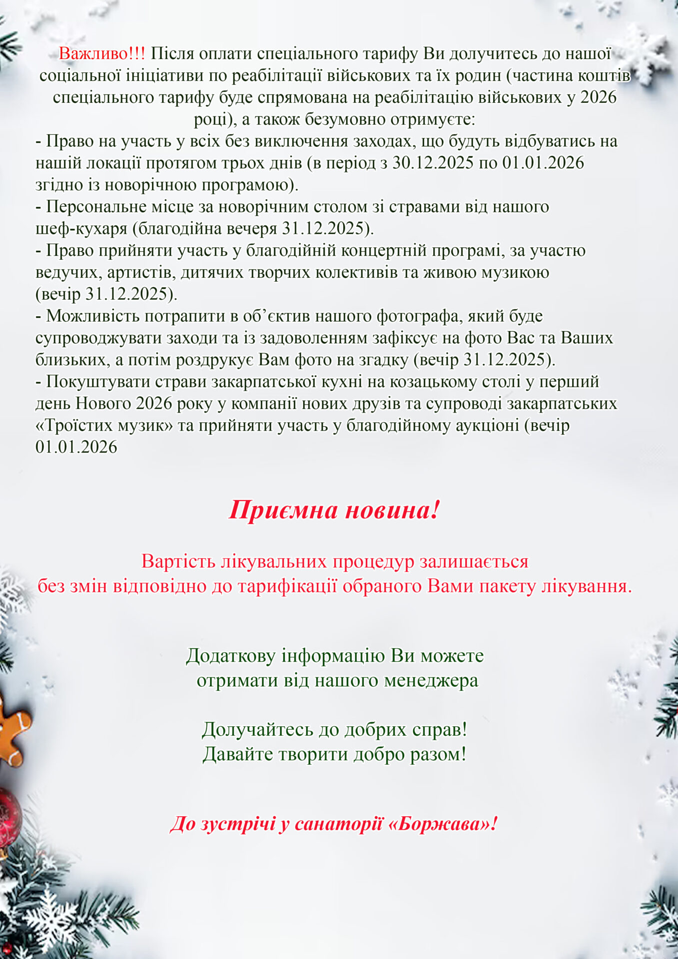 И главное! Вы получите психологическую разгрузку и оздоровитесь, поскольку в течение всего срока Вашего отдыха медицинские процедуры будут отпускаться по обычному расписанию в соответствии с Вашей программой лечения. Вместе мы дарим не только праздник, но и силу для новой жизни тем, кто в этом нуждается. Итак, празднуя с нами, Вы становитесь частью великой миссии. Мы начинаем 30 декабря 2025 и до 1 января 2026 Вы погрузитесь в атмосферу закарпатского колорита, посетите творческие мастер-классы, увидите закарпатский фольклор и традиции, пообщаетесь с замечательными гостями нашей здравницы. Ваши дети примут участие в развлечениях и получат подарки от Санты. И все это вместе дополнит Вашу основную цель – оздоровление целебными свойствами Закарпатья! Санаторий «Боржава» – время отдыха с пользой!